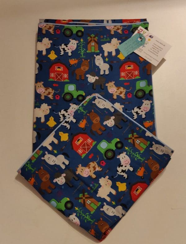 Baby sengetøj, blå med bondegård og lyseblå kanter.