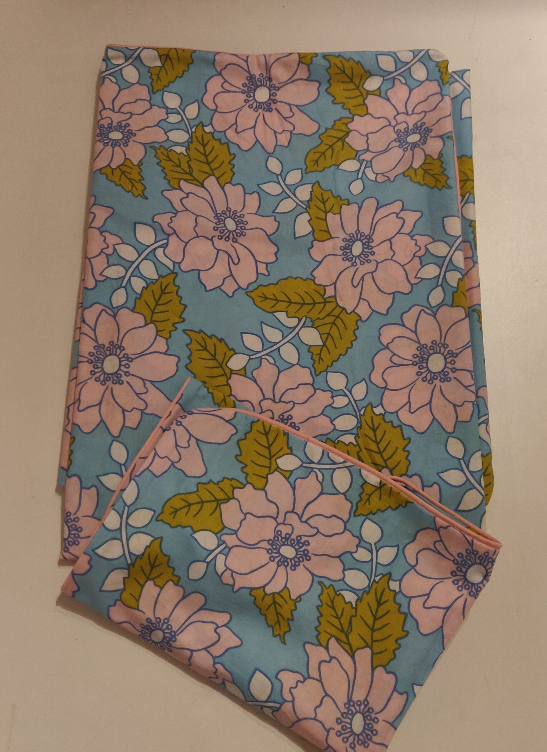 Baby sengetøj, blå med rosa blomster og lyserøde kanter.