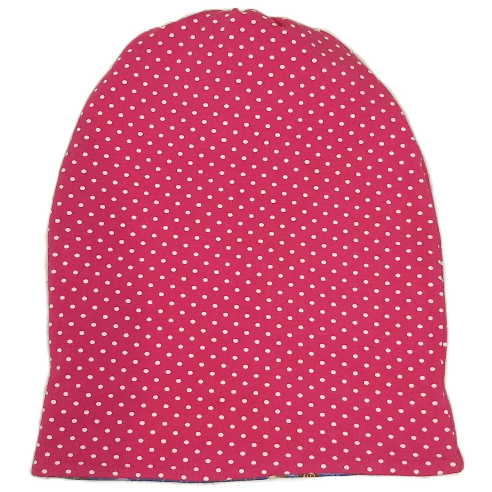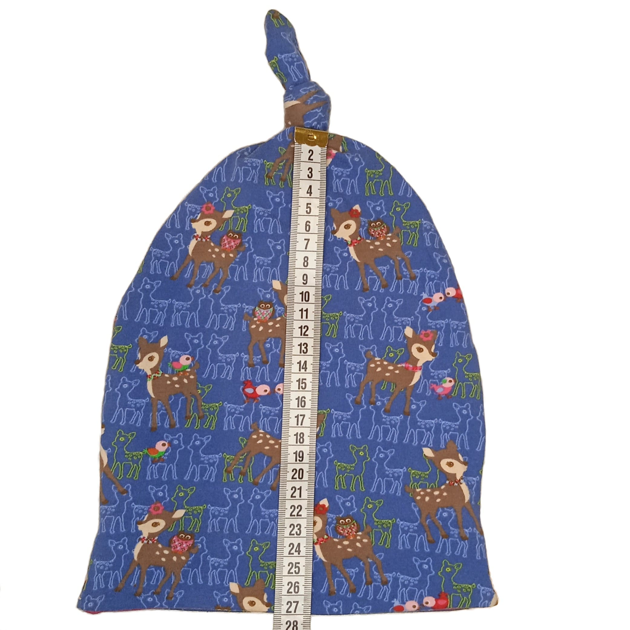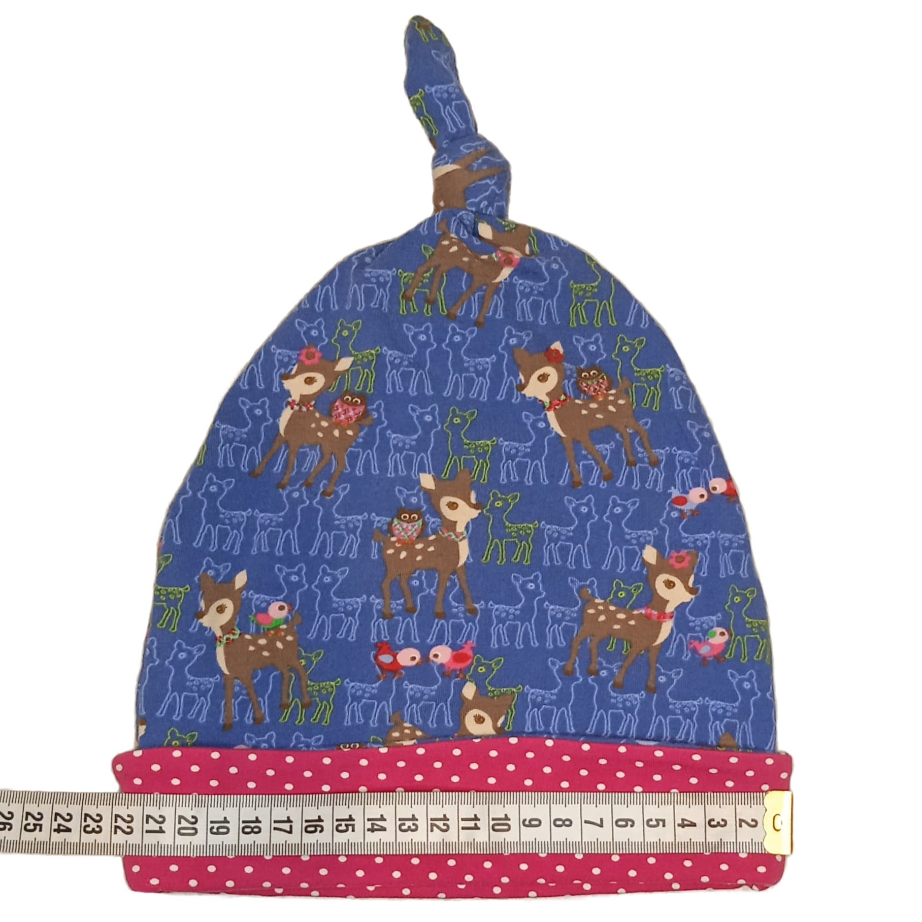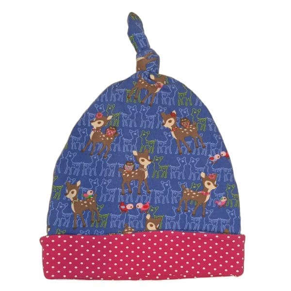 Babyhue med sød bambi på blå baggrund, med kant af rødt stof med hvide prikker.