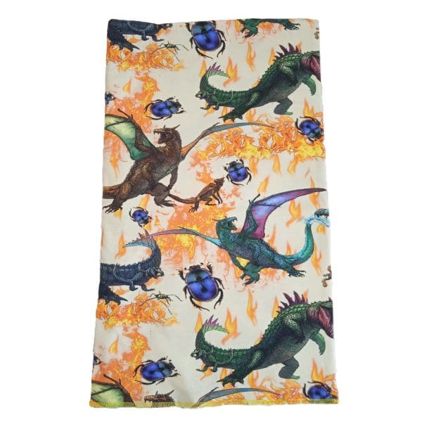 Beige halsedisse med fantasidyr, farverig, spraglende og dobbeltsidet, samt bare flotte spraglet farver hvis den er krøllet helt sammen om halsen.