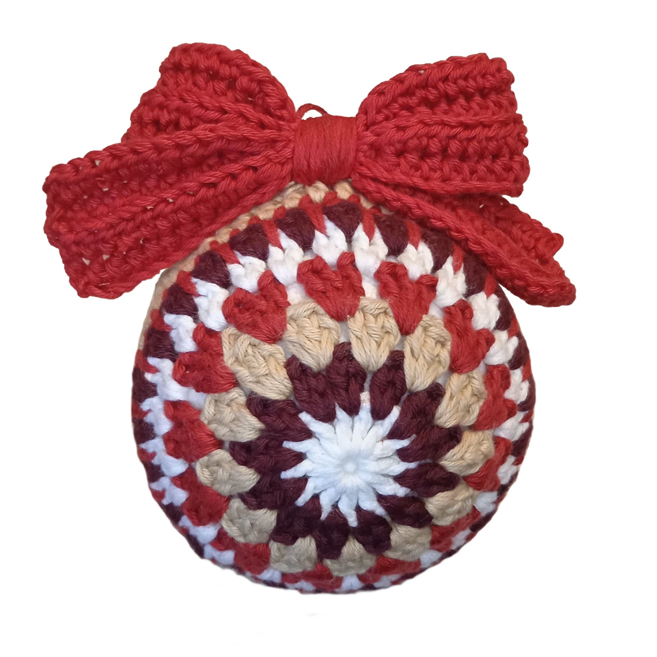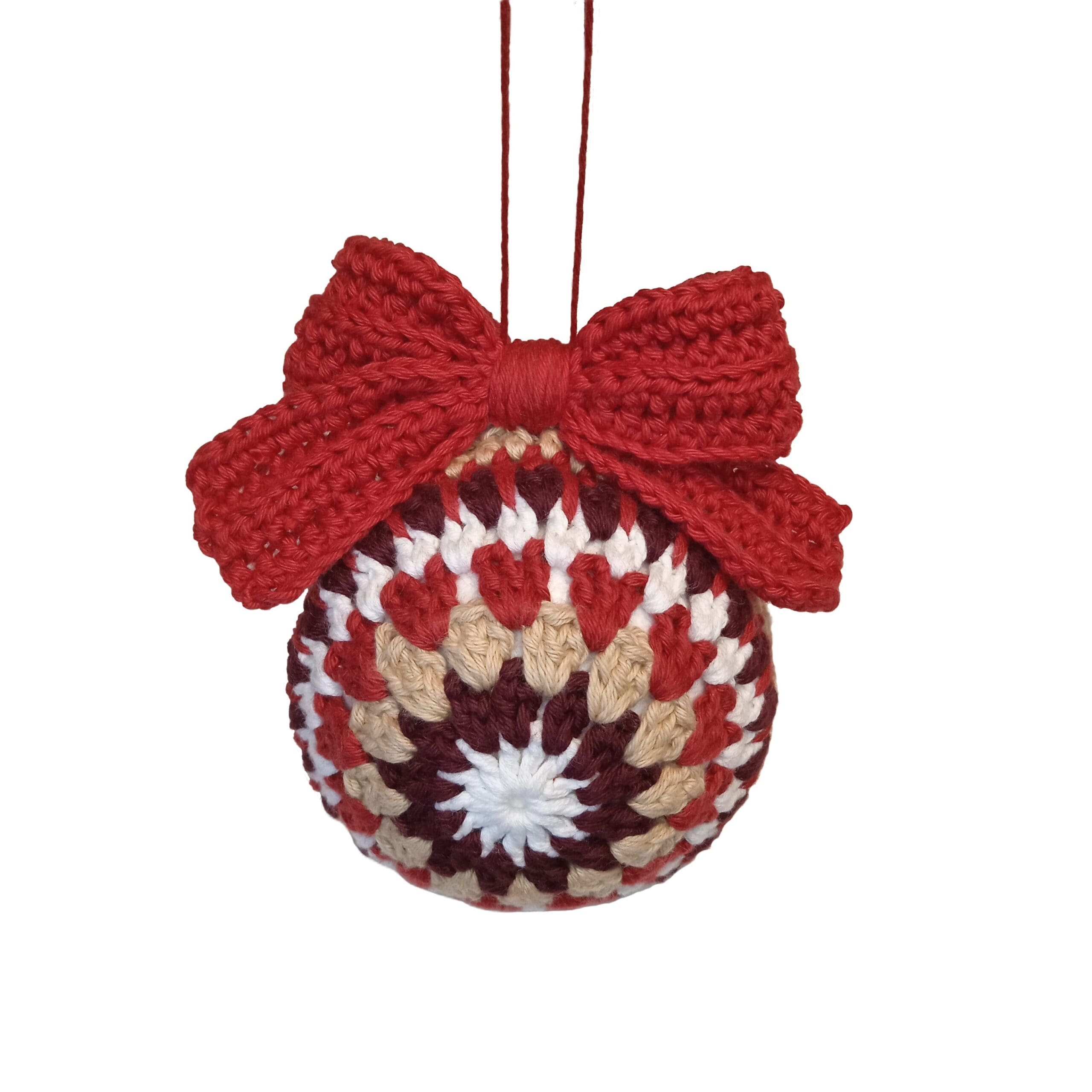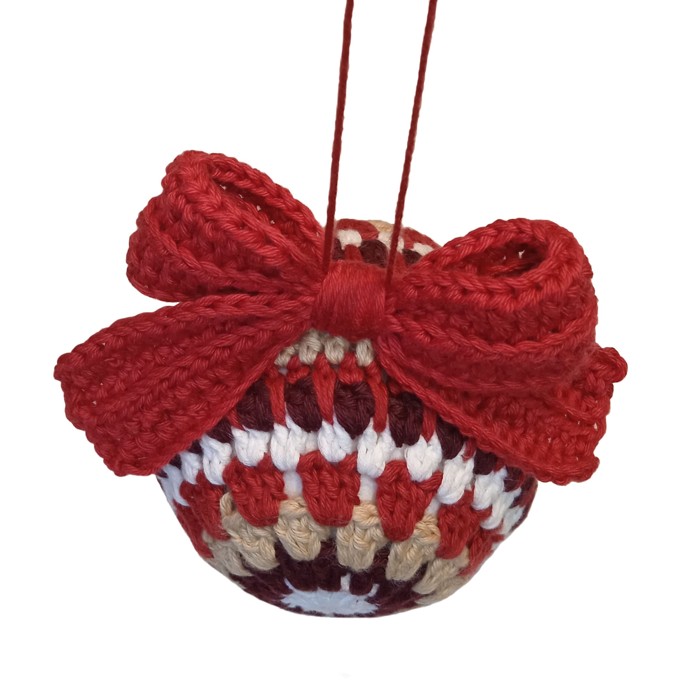 Denne håndlavet, hæklet julekugle med sløjfe kan bruges som pynt både til træet og ophæng i huset.