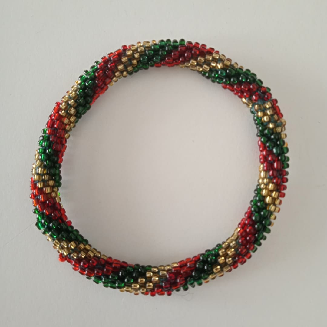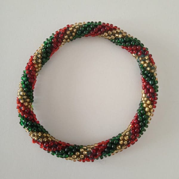 Hæklet perlearmbånd – grøn, rød og guld