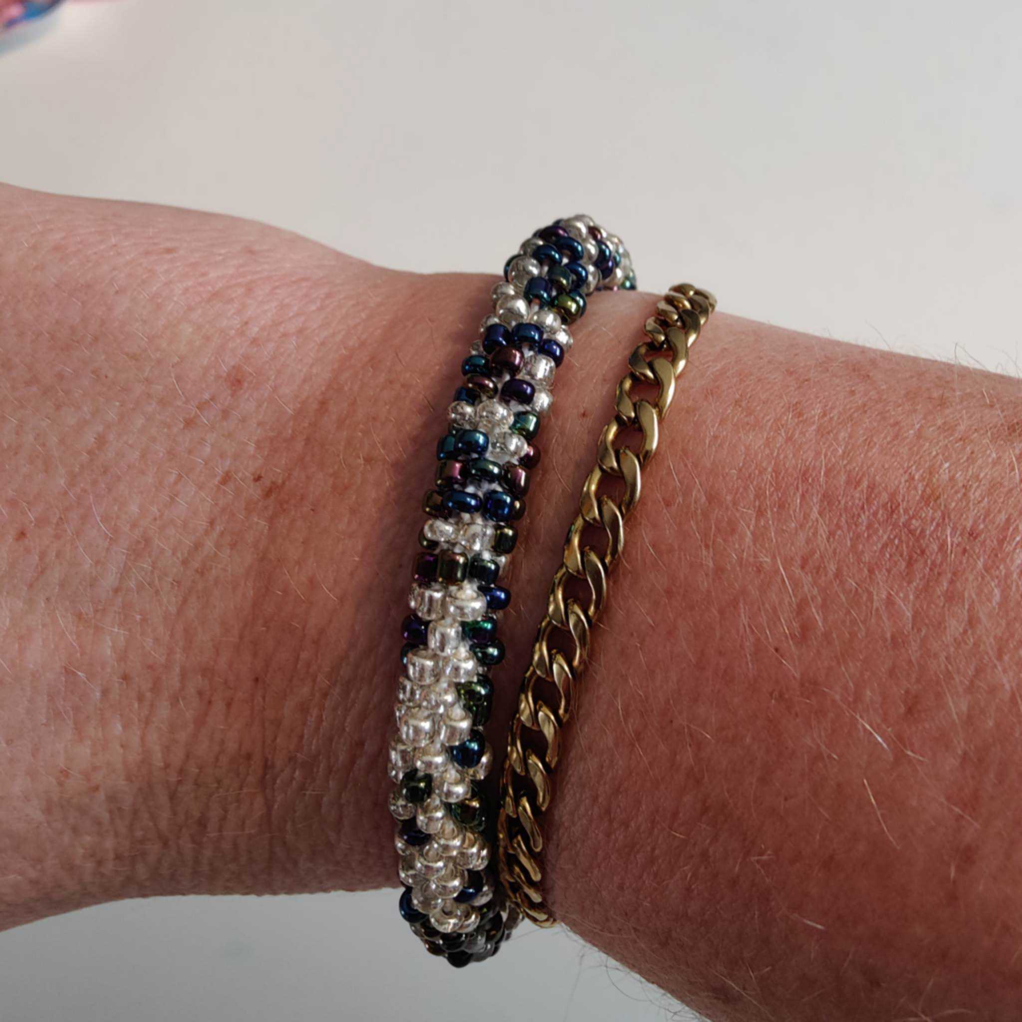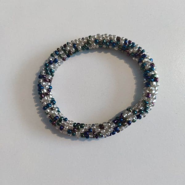 Hæklet perlearmbånd – Sølv, blå, lilla, grøn