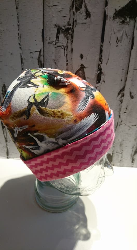 Hue i print med heste med vinger, samt kant i rød og lyserød zig zag.