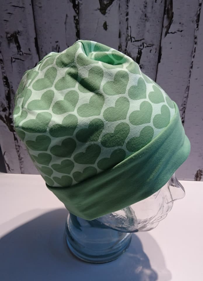 Hue med hjerter i grønne farver. Str. 50-56 cm