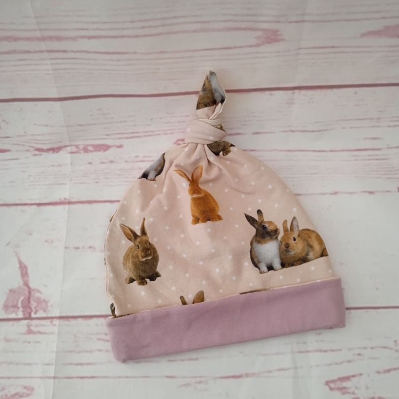 Sød babyhue med søde kaniner. Str. 42-48 cm