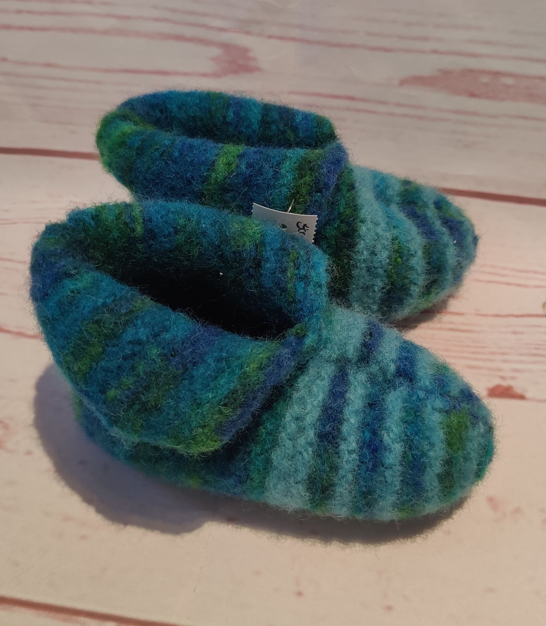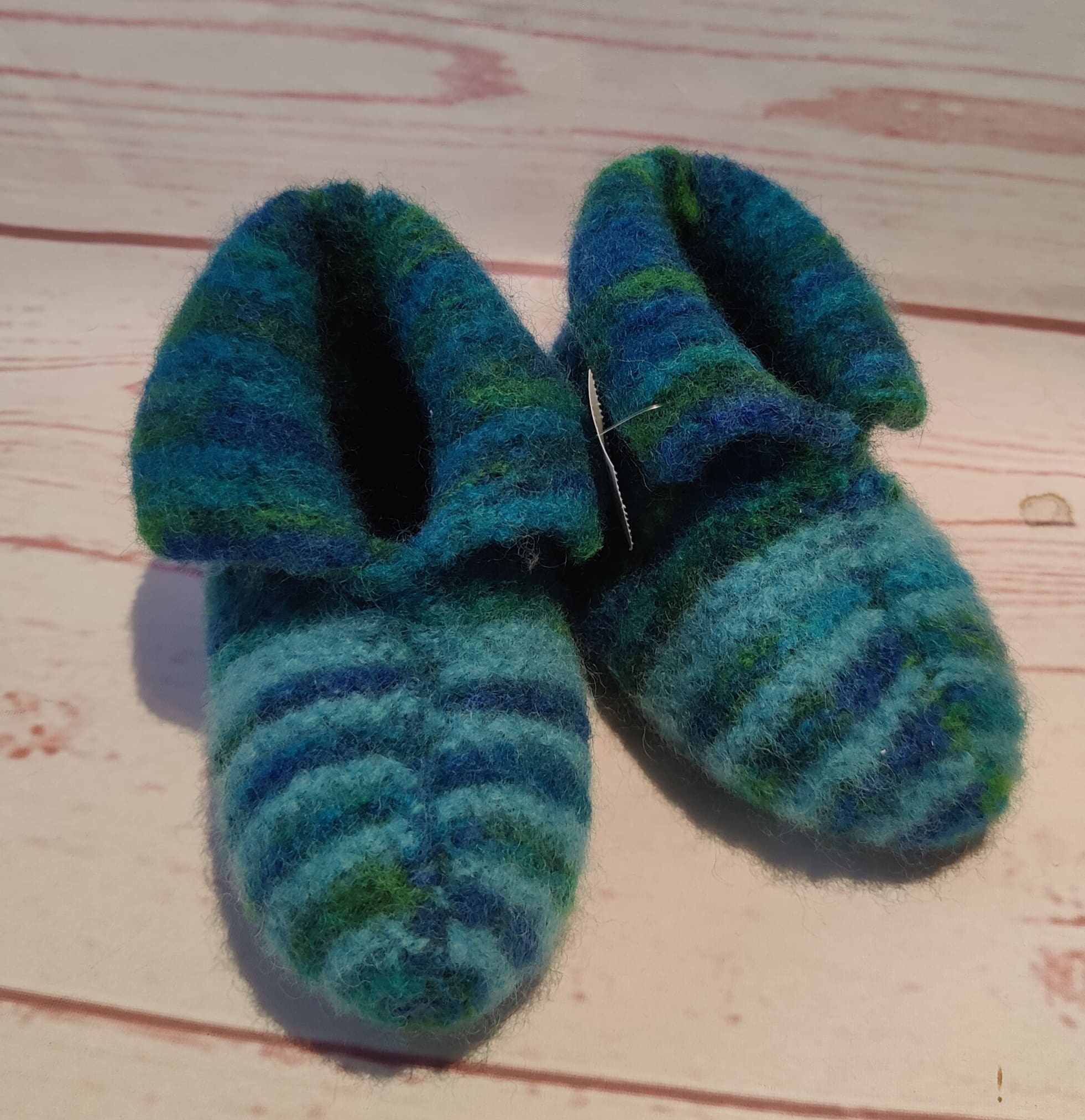 Lækre varme sutsko, strikket i uld og filtet i vaskemaskinen.
